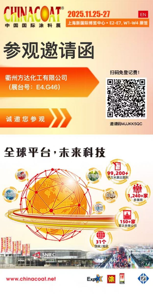當(dāng)“碳達(dá)峰、碳中和”成為全球涂料行業(yè)的共同命題,一場(chǎng)關(guān)于綠色原料的“革命”正在悄然發(fā)生——衢州方達(dá)化工有限公司率先交出高分答卷!2025年11月25-27日,上海新國際博覽中心(SNIEC),方達(dá)化工將攜“專注新材料領(lǐng)域,用綠色原料編織低碳未來”的硬核實(shí)力,震撼亮相中國國際涂料展(CHINACOAT 2025)E4.G46展臺(tái)。